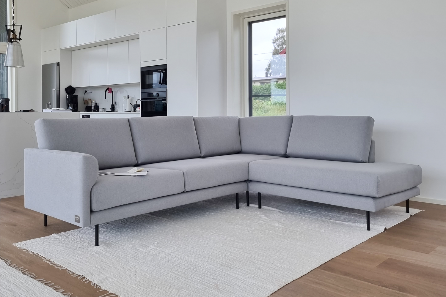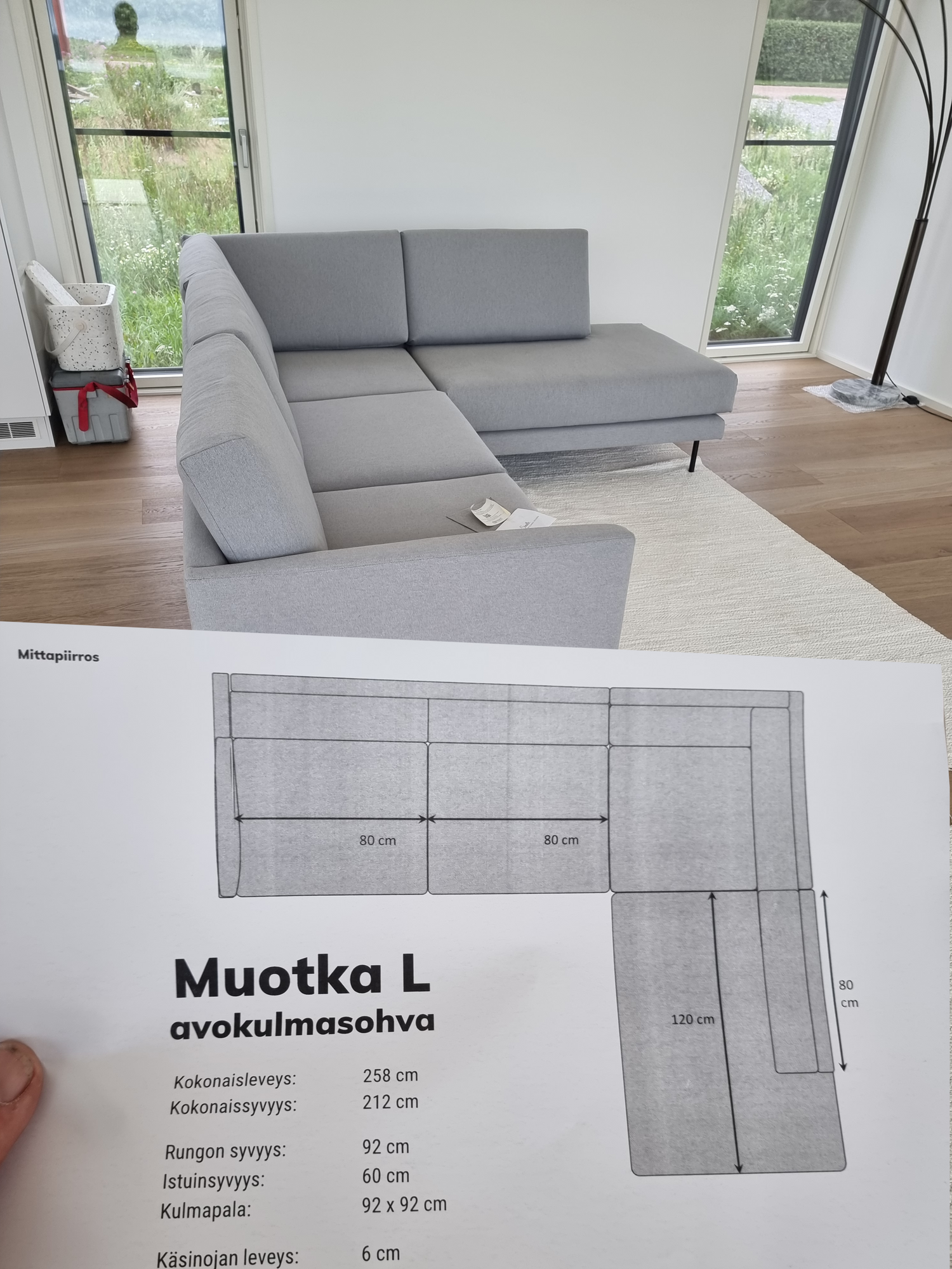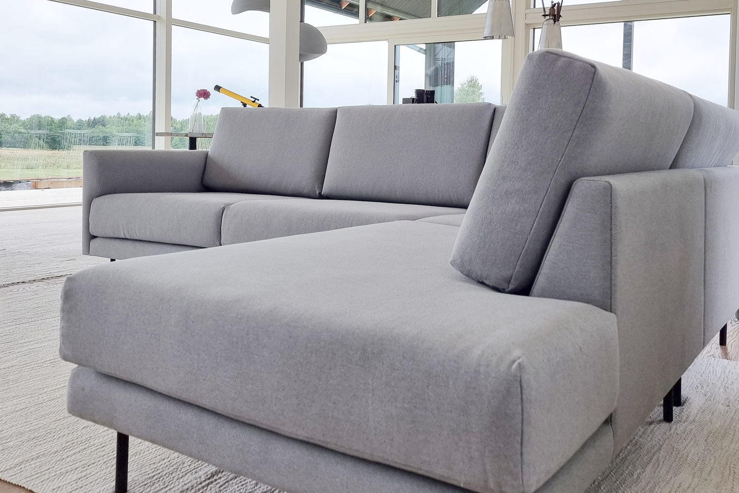 Asiakkaallemme valmistui uusi talo meren rannalle Pernajaan ja saimme kunnian valmistaa sinne sohvan! Valoisa olohuoneen ja keittiön yhdistelmätila kylpee päivävalossa, sillä yksi seinä on kokonaan lasia. Suurten ikkunoiden myötä luontokin tuntuu tulevan lähelle. Muotka näyttää modernilta mustine, kapeine tolppajalkoineen ja raikkaan harmaine verhoiluineen. Sohvassa on medium-vaahtomuovitäytteet ja kankaana Lauritzonin Story 018.