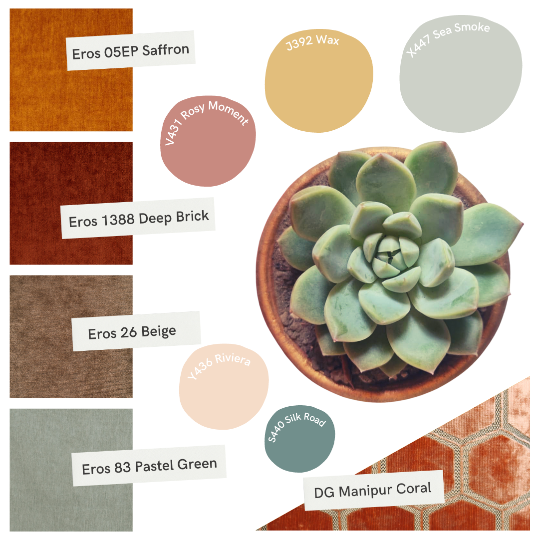 Kanelinruskea, terrakotta, vihreä, keltainen ja hento vaaleanpunainen. Myös kestosuosikki harmaa pitää pintansa, tulevalle vuodelle ennustetaan lämpimien harmaiden paluuta. Salvianvihreä on maaleissa ja tapeteissa tehnyt tuloaan ja se onkin samalla rauhoittava ja lempeä väri, joka sopii kaikkiin tiloihin. Myös koralliin vivahtava punaista nähdään tänä vuonna ja se sopiikin salvian kaveriksi mainiosti.