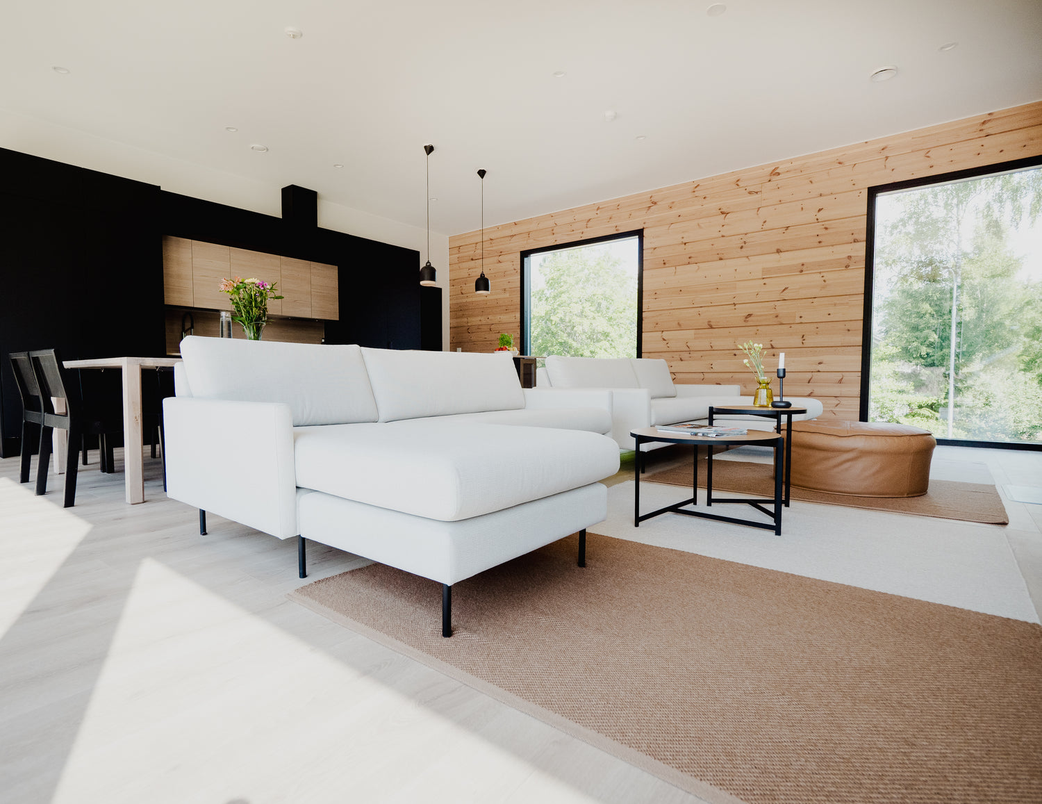Kaisa ja Markus valitsivat kotiinsa leppoisat Lakka-divaanisohvat erikoismitoin. He olivat kääntyneet sisustussuunnittelijan apuun kotinsa avaran olohuone-keittiö -yhdistelmän sisustuksen kanssa ja valintoja tehtiin laatu ja kotimaisuus edellä. Kysyimme tarkemmin asiakkaan päätöksestä valita sohvansa juuri meiltä. “Halusimme kotiimme lähtökohtaisesti mahdollisimman paljon kotimaisia tuotteita mikäli laatu ja muut kriteerit täyttyvät. Teiltä sohvan sai omilla mitoilla laadukkailla materiaaleilla ja järkevällä hinnalla.” Idea kahdesta divaanisohvasta tuli sisustussuunnittelijalta. Sohvien divaaniosia lyhennettiin 160 cm:iin, jotta olohuoneeseen jäi enemmän tilan tuntua. Muokattavuus ja mahdollisuus valita juuri itselle sopivat vaihtoehdot olivat Kaisalle ja Markukselle tärkeitä. “Sohva tehtiin täysin meidän mitoilla. Lisäksi valitsimme kovuudet niin tyynyihin kuin istuinosaan erikseen. Myös kangas ja jalat valittiin muuhun sisustukseen sopivaksi.”