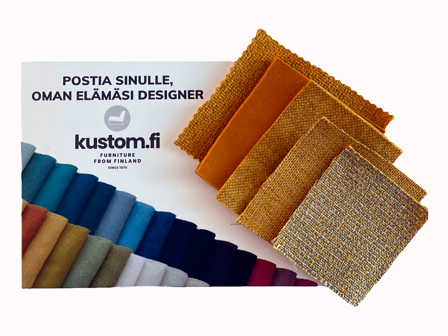 Materiaaleihin on parasta tutustua omassa kodissa kaikessa rauhassa. Valitse verkkosivuiltamme haluamasi kangas- tai nahkanäytteet ja toimitamme ne maksutta kotiisi. Voit siten tutustua, miltä kankaan sävy näyttää kotisi valaistuksessa ja kuinka hyvin se sopii muuhun sisustukseen. Näytepalat voit tilata täältä. Myös istuin- ja selkätyynyjä saa tilattua kotiin testattavaksi. Tyynynäytteet voi tilata täältä.