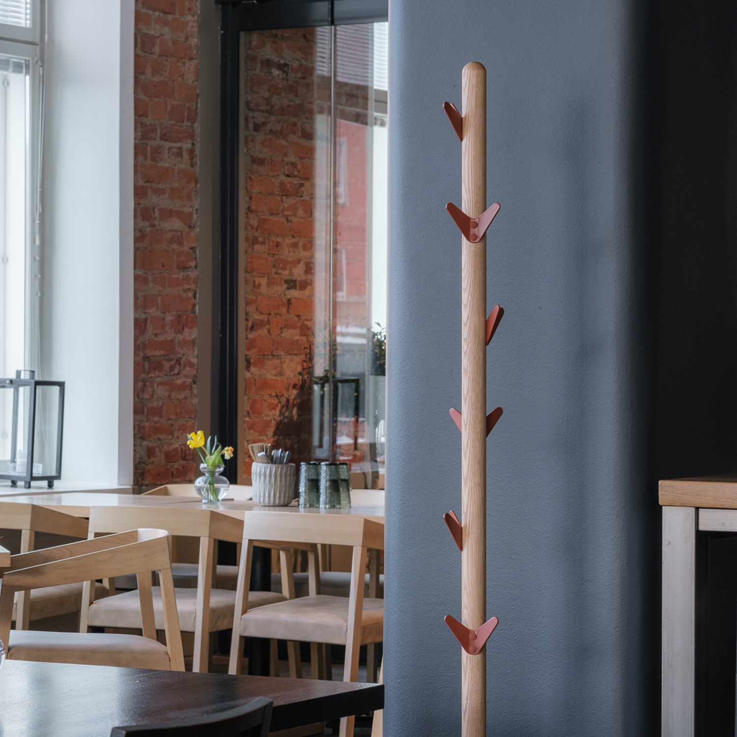 Yhteistyössä Young Finnish Designerin Marjut Nousiaisen suunnittelema ja Kustomin toteuttama puurunkoinen vaatenaulakko on kuin kotonaan niin lapsiperheen eteisessä kuin ravintolan ovensuussakin.